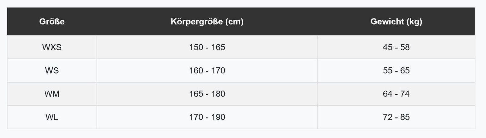 Größe Körpergröße (cm) Gewicht (kg) WXS 150 - 165 45 - 58 WS 160 - 170 55 - 65 WM 165 - 180 64 - 74 WL 170 - 190 72 - 85