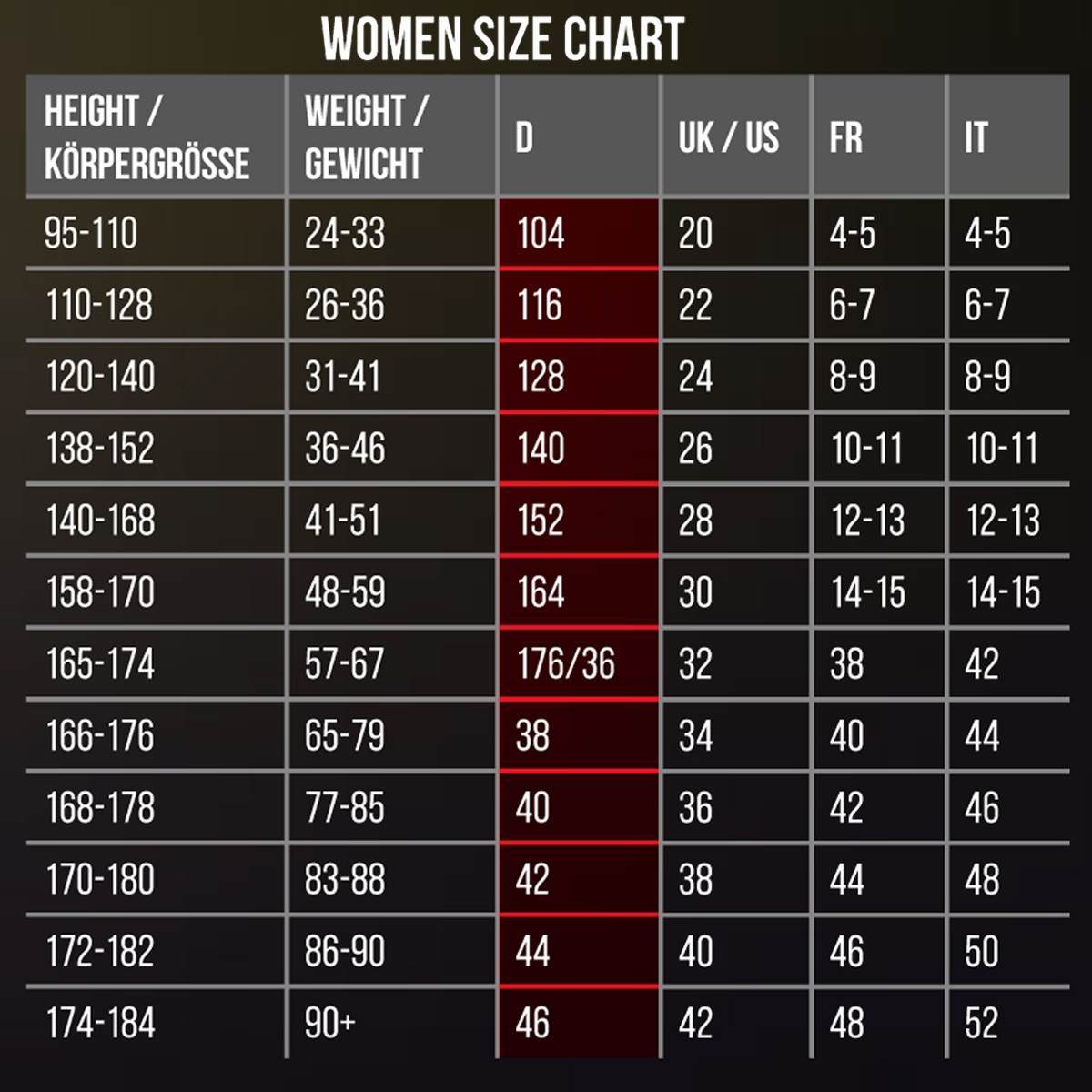 | Height | (CM) | Weight | (KG) | D | UK/US | FR | I |