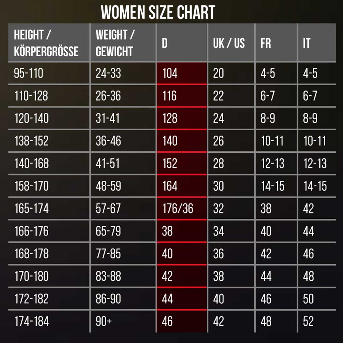 Größentabelle Height (CM) Weight (KG) D UK/US FR I Körpergröße Gewicht 95-110 24-33 104 20 4-5 4-5 110-128 26-36 116 22 6-7 6-7 120-140 31-41 128 24 8-9 8-9 138-152 36-46 140 26 10-11 10-11 140-168 41-51 152 28 12-13 12-13 158-170 48-59 164 30 14-15 14-15 165-174 57-67 176/36 32 38 42 166-176 65-79 38 34 40 44 168-178 77-85 40 36 42 46 170-180 83-88 42 38 44 48 172-182 86-90 44 40 46 50 174-184 90+ 46 42 48 52